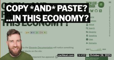 Eleventy (11ty), an award-winning open source site generator. At one point he became entirely too fixated on web fonts. He has given 86 talks in nine different countries at events like Beyond Tellerrand, Smashing Conference, Jamstack Conf, CSSConf, and The White House. Formerly part of CloudCannon, Netlify, Filament Group, NEJS CONF, and NebraskaJS. Read more about Zach »